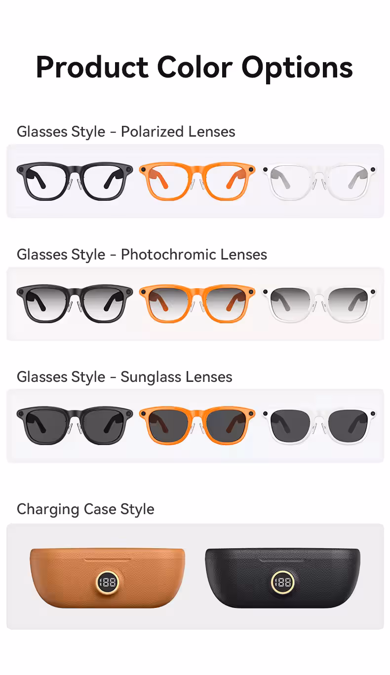 * ChatGPT Integration: Voice-activated AI assistant for Q&A and object recognition. * Real-time Translation: Supports two-way voice translation in over 100 languages. * POV Recording: Hands-free first-person perspective video and photo capture. * Connectivity: * WiFi Real-Time Sync: Instant wireless transfer of videos and photos to a smartphone. * Bluetooth Calling & Music: Hands-free calls and wireless audio streaming. * Audio & Optics: * Open-Ear Audio: Integrated speakers for stereo sound while remaining aware of surroundings. * Lens Protection: Blue light filtering, UV protection, and polarized lenses to reduce glare. * Power Management: * Portable Charging: The storage case doubles as a high-capacity power bank.